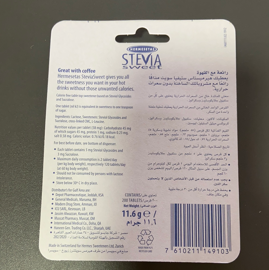 220 قرص في العبوة: يدوم لفترة طويلة، مع كل قرص يعادل ملعقة صغيرة من السكر.