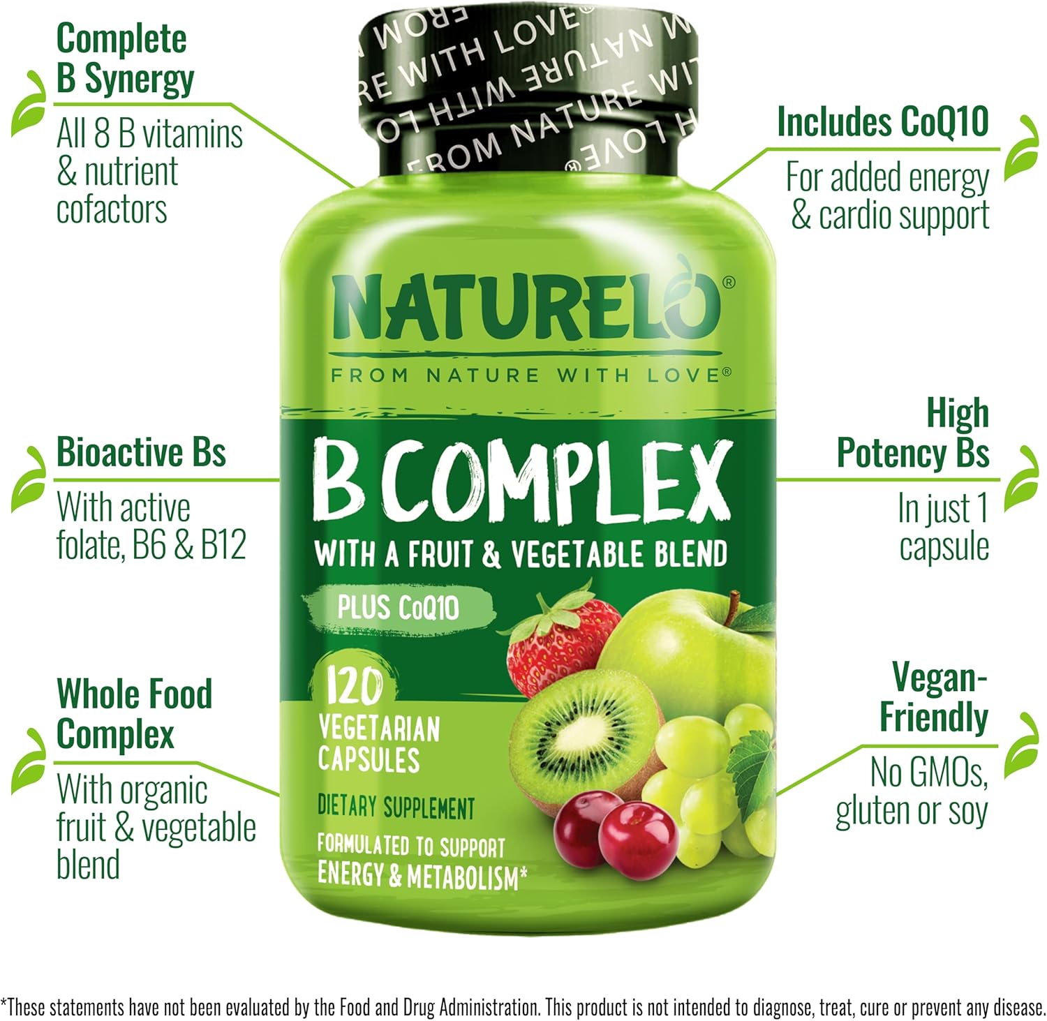 مركب فيتامين ب من NATURELO مع ميثيل ب12، ميثيل حمض الفوليك، فيتامين ب6، والبيوتين، بالإضافة إلى الكولين، CoQ10، ومزيج من الفواكه والخضروات - يدعم الطاقة والتكيف مع الإجهاد - نباتي - 120 كبسولة
