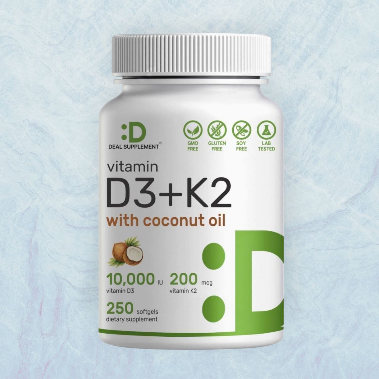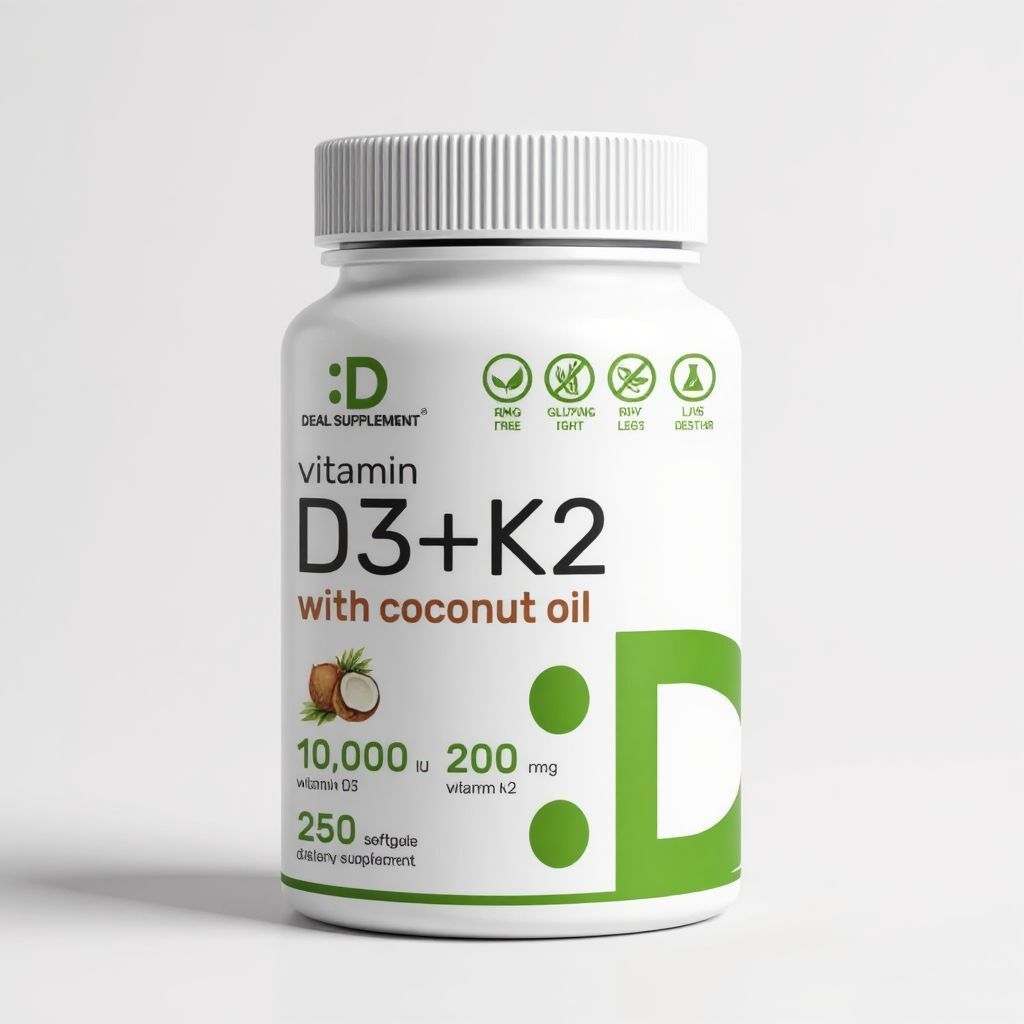 مكمل غذائي DEAL فيتامين د3 (10000 وحدة دولية) + فيتامين ك2 (MK7) بتركيز 200 ميكروجرام، صيغة متطورة مدعمة بزيت جوز الهند البكر عالي الجودة لتعزيز الامتصاص والاستفادة القصوى. يحتوي هذا المنتج على جرعة مثالية ومضاعفة من فيتامين د3 الذي يدعم صحة العظام والمفاصل والأسنان، بالإضافة إلى فيتامين ك2 الذي يعمل بتناغم لتعزيز امتصاص الكالسيوم وتحسين صحة القلب والأوعية الدموية.
